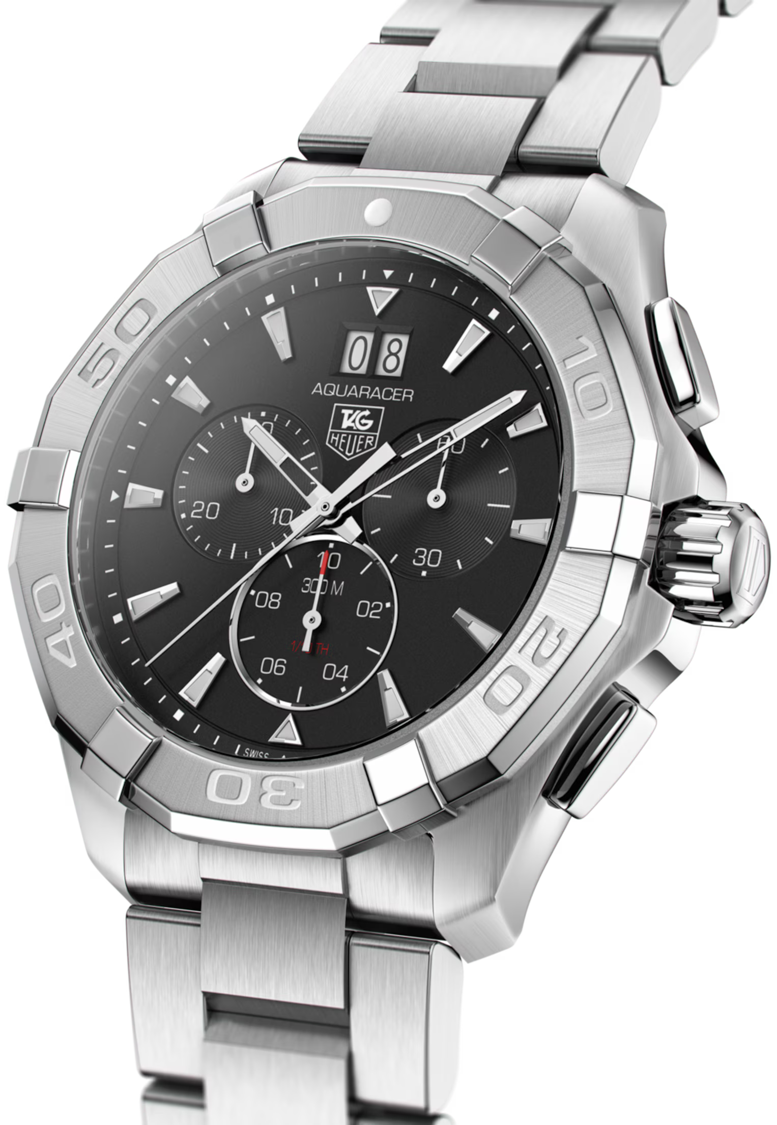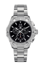 The TAG Heuer Aquaracer Quartz (Model CAY1110.BA0927) is a 43 mm Swiss-made professional dive watch for men, featuring a stainless steel case, black opaline dial, and a steel bracelet. Powered by a Quartz movement, it offers Chronograph and Grande Date functions, designed for precision, ruggedness, and reliability with water resistance up to 300 meters.