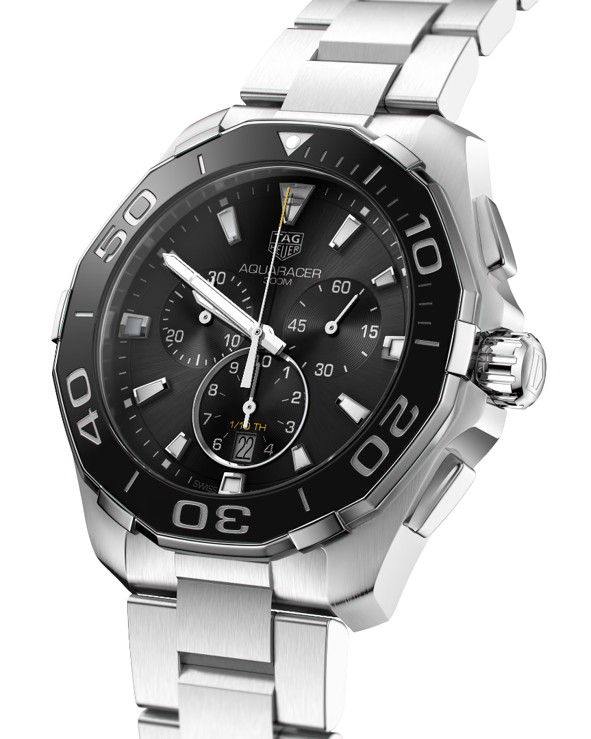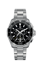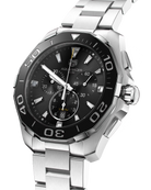 The TAG Heuer Aquaracer Quartz Chronograph (Model CAY111A.BA0927) is a 43 mm Swiss-made professional dive watch with a stainless steel case and black sunray-brushed dial. Featuring chronograph counters at 3, 6, and 9 o’clock with azurage effect and polished rhodium-plated hands, this bold and sophisticated timepiece is built to handle every challenge. Water-resistant up to 300 meters.