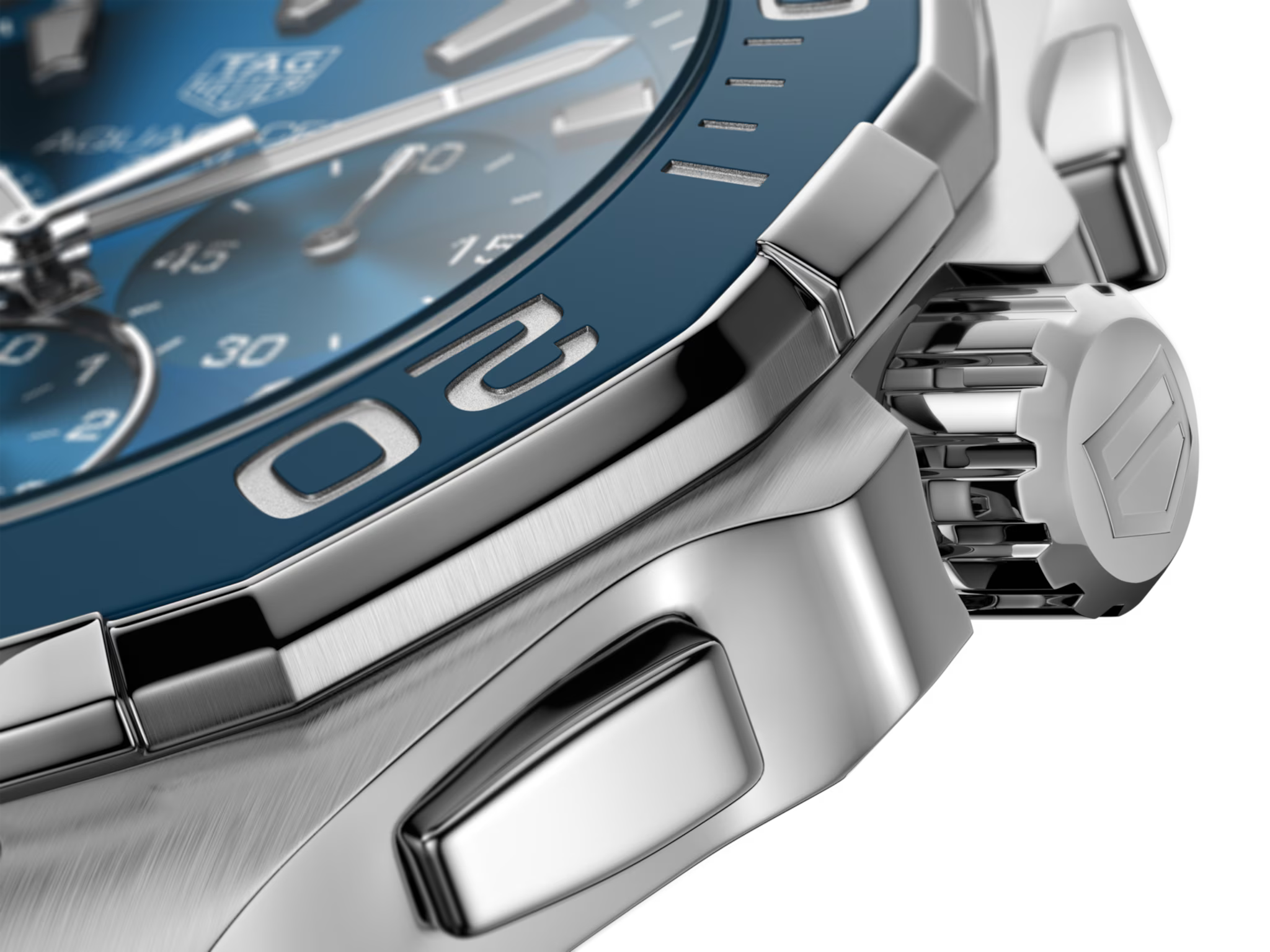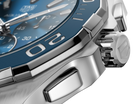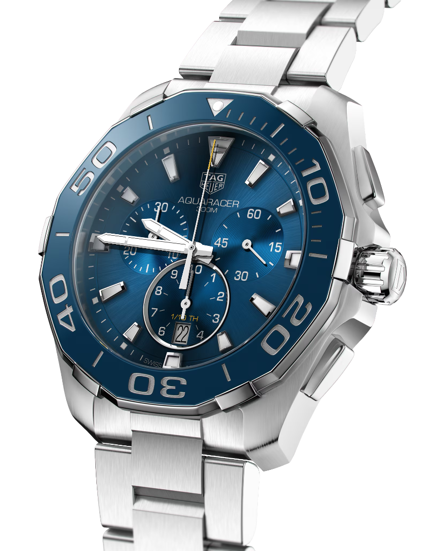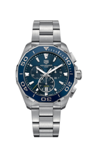 The TAG Heuer Aquaracer Quartz Chronograph (Model CAY111B.BA0927) is a 43 mm Swiss-made professional diving watch. Designed for rugged aquatic performance, it features a stainless steel case, blue sunray-brushed dial, and chronograph functionality with 1/10 second, seconds, and 30-minute counters, along with a date display. With a water resistance up to 300 meters, screw-down crown, and a robust steel bracelet, this watch continues TAG Heuer’s legacy in high-pressure watersports dating back to 1895.