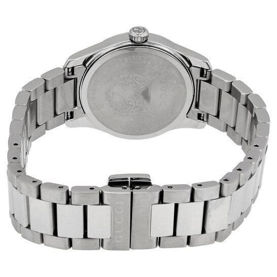 The Gucci G-Timeless YA1265025 watch is crafted with a stainless steel case and matching stainless steel bracelet, finished with a fixed stainless steel bezel. The pink mother of pearl dial features the Mystic Cat design, complemented by silver-tone hands and diamond hour markers. Designed in a round case shape with a solid case back, this analog timepiece is powered by a quartz movement and protected by a scratch-resistant sapphire crystal. A pull / push crown and deployment clasp complete the design, making it a refined dress-style watch from the G-Timeless collection.