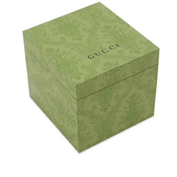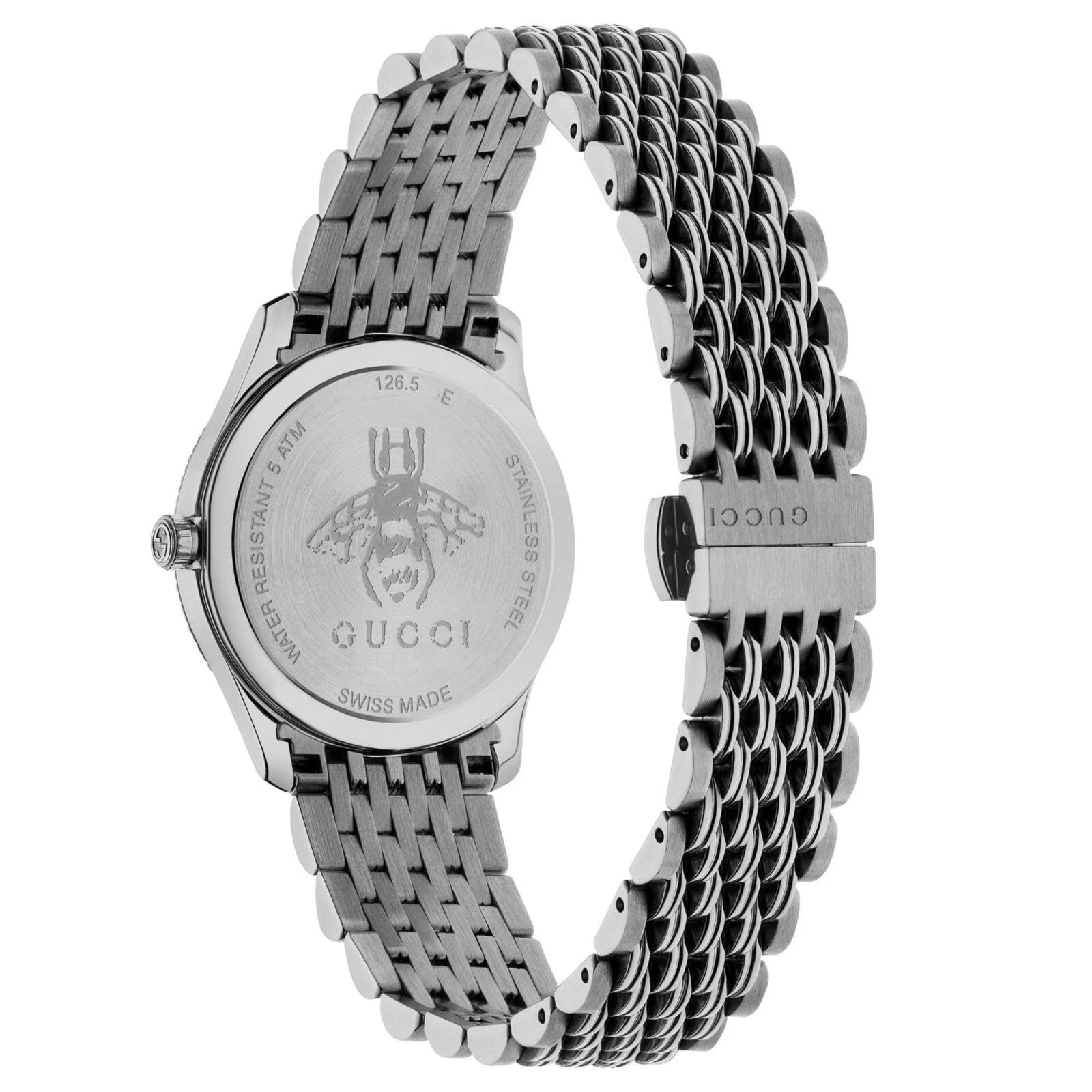 The GUCCI G-Timeless YA1265020 watch is crafted with a stainless steel case and matching stainless steel bracelet, offering a refined and elegant look. Designed with a black dial featuring silver-tone hands and index hour markers, this timepiece reflects classic Gucci styling. Powered by a quartz movement with Caliber ETA F04.105, it is protected by scratch-resistant sapphire crystal and offers water resistance up to 50 meters. This Swiss Made watch is designed as a dress-style timepiece with a timeless aesthetic.