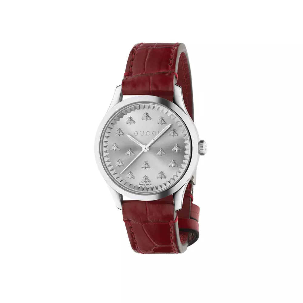 GUCCI G-TIMELESS 32mm Silver Sunbrushed Dial Bee Red Leather Watch
