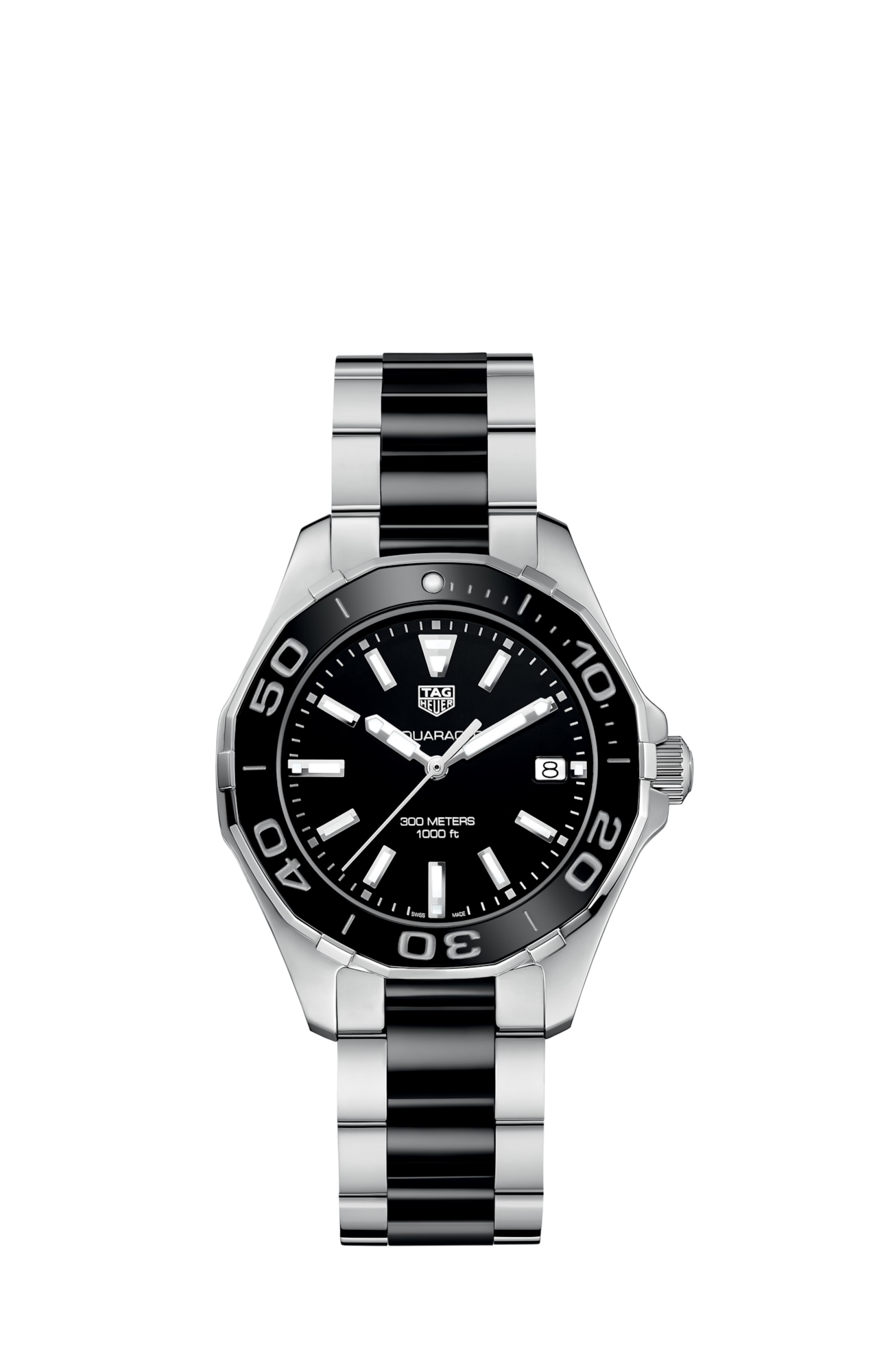 The TAG Heuer Aquaracer Quartz (Model WAY131A.BA0913) is a fashion-forward and sophisticated ladies’ watch. Its 35 mm polished steel case frames a sleek black lacquered dial, paired with a polished steel and ceramic bezel and bracelet. Powered by a reliable Swiss-made quartz movement, it features a screw-down crown, turning bezel, and water resistance up to 300 meters. The steel and ceramic bracelet with folding clasp ensures comfort and durability, making it perfect for both underwater adventures and stylish city wear.