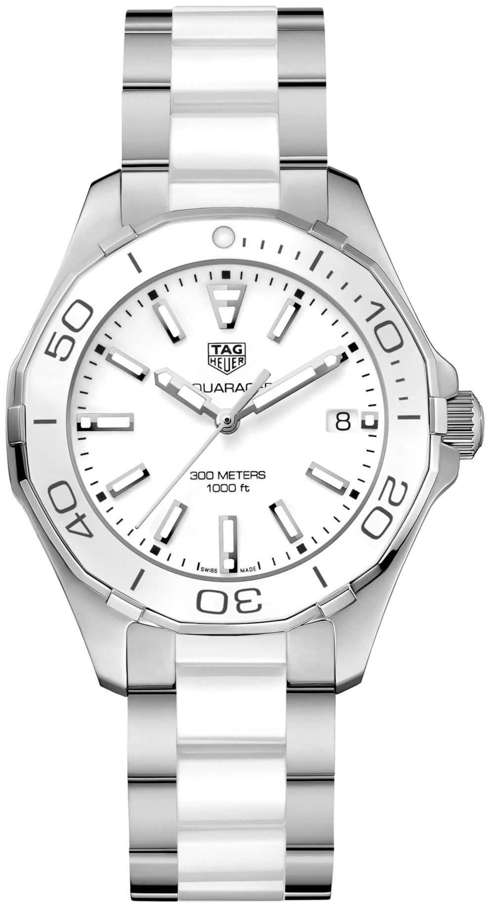 The TAG Heuer Aquaracer Quartz (Model WAY131B.BA0914) is a sophisticated and elegant ladies’ watch. Its 35 mm polished steel case frames a crisp white dial, powered by a precise Swiss-made quartz movement. Designed for both style and durability, it features a screw-down crown, turning bezel, and water resistance up to 300 meters. The steel and ceramic bracelet ensures a comfortable fit, making this watch perfect for everyday wear or special occasions.