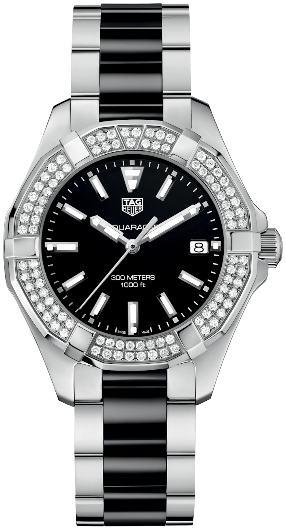 The TAG Heuer Aquaracer Quartz (Model WAY131E.BA0913) is a refined and elegant ladies’ watch, combining Swiss precision with sporty sophistication. Its 35 mm polished steel case frames a striking black lacquered dial with applied indexes. Powered by a reliable quartz movement, this watch features a screw-down crown, turning bezel set with 95 diamonds (0.501 ct.), and water resistance up to 300 meters. The steel and ceramic bracelet adds durability and comfort, making this timepiece perfect for both everyday wear and special occasions.