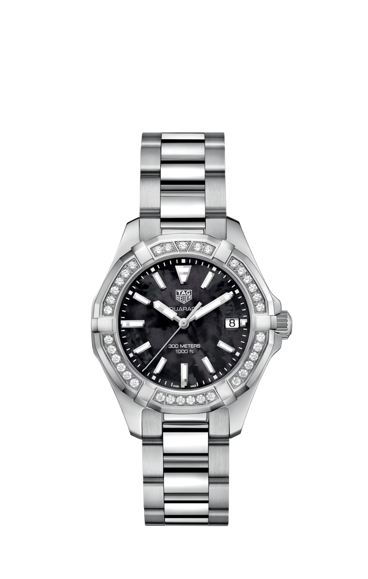 The TAG Heuer Aquaracer (Model WAY131P.BA0748) blends stainless steel strength with feminine elegance. Featuring a 35 mm polished steel case, black mother-of-pearl dial, and 35-diamond unidirectional turning bezel (0.593 ct), this quartz watch is both luxurious and functional. Applied indexes and luminous hands ensure readability, while the steel bracelet with folding clasp and screw-down crown completes a sophisticated, versatile timepiece. Water-resistant up to 300 meters, it’s perfect for daily wear or aquatic adventures.