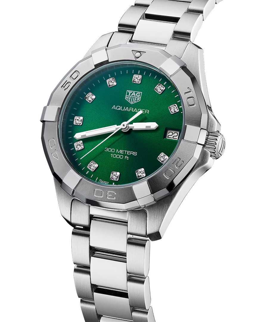 Elevate your style with the TAG Heuer Aquaracer Lady WBD1316.BA0740, a 32 mm quartz watch that blends luxury and sportiness. The sunray-brushed green dial features 11 sparkling diamonds (0.11 CT) as hour markers, while the polished and brushed steel case and bracelet ensure timeless elegance. With a screw-down crown, turning bezel, and 300 m water resistance, this watch is both stunning and practical for active lifestyles.