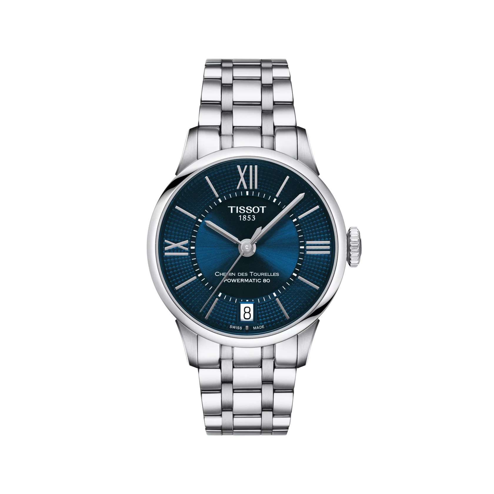 The Tissot Chemin des Tourelles Powermatic 80 Lady (T099.207.11.048.00) is a sophisticated timepiece combining Swiss heritage with contemporary elegance. Named after the historic street in Le Locle, Switzerland, where Tissot was founded in 1907, this watch features a 32 mm stainless steel case, a blue dial with Roman and index markers, and a see-through caseback to admire the Swiss automatic movement with up to 80 hours of power reserve. The grey stainless steel strap with a butterfly clasp completes a luxurious design, perfect for everyday wear or special occasions.