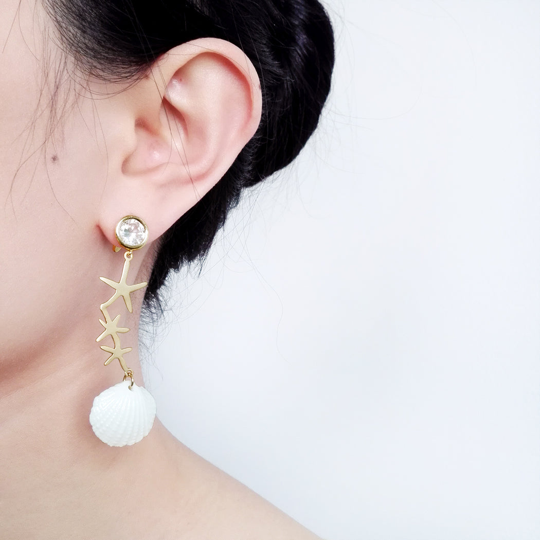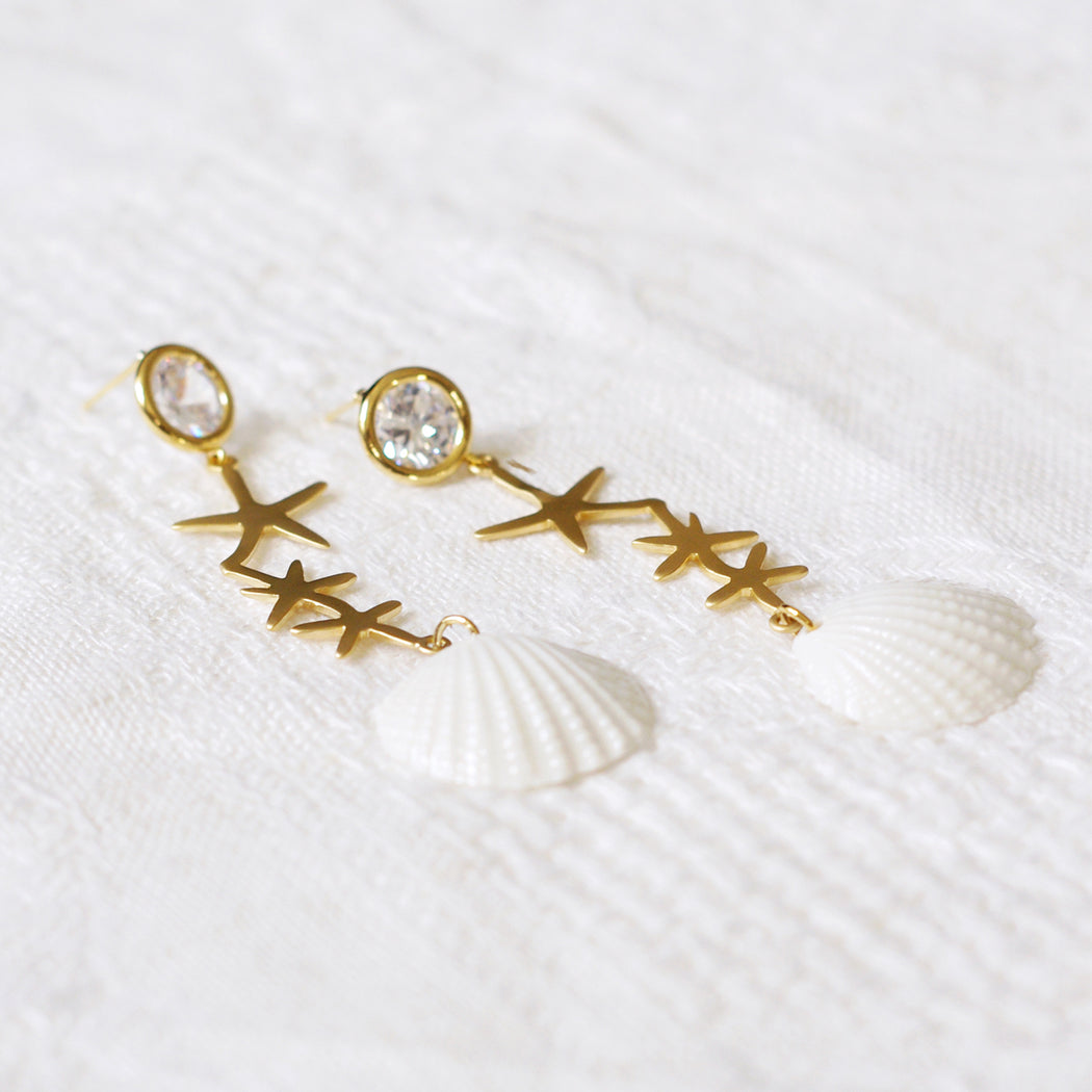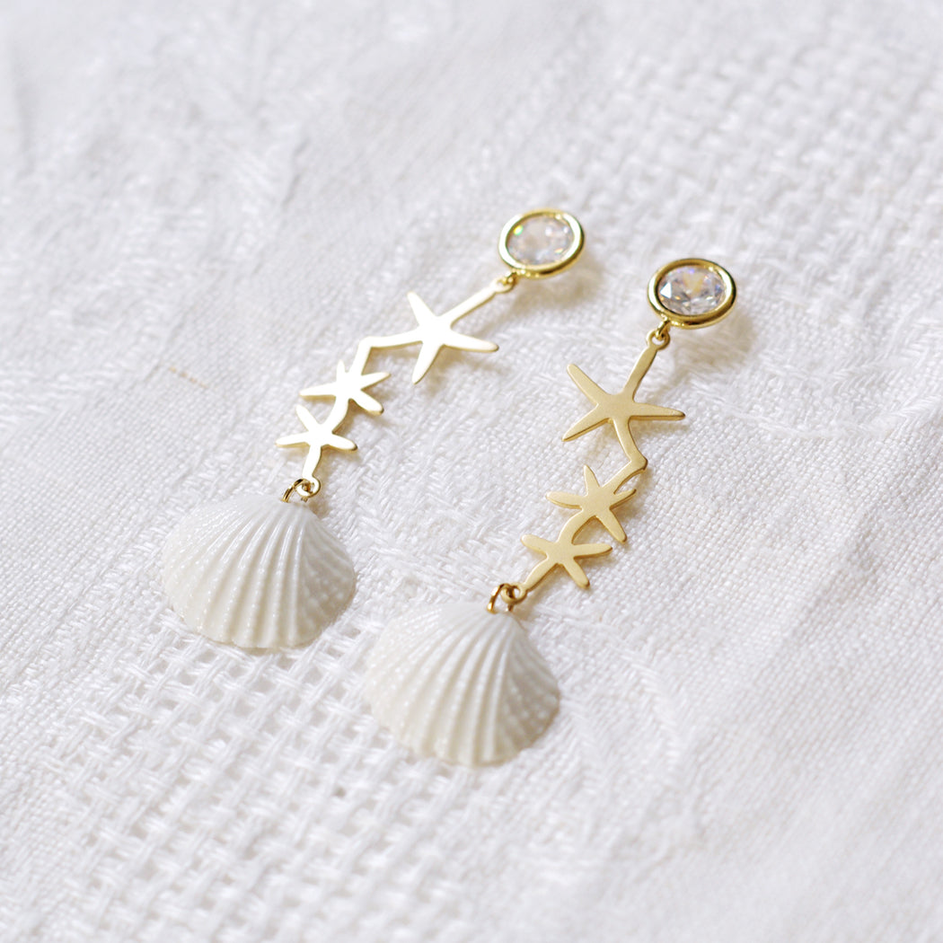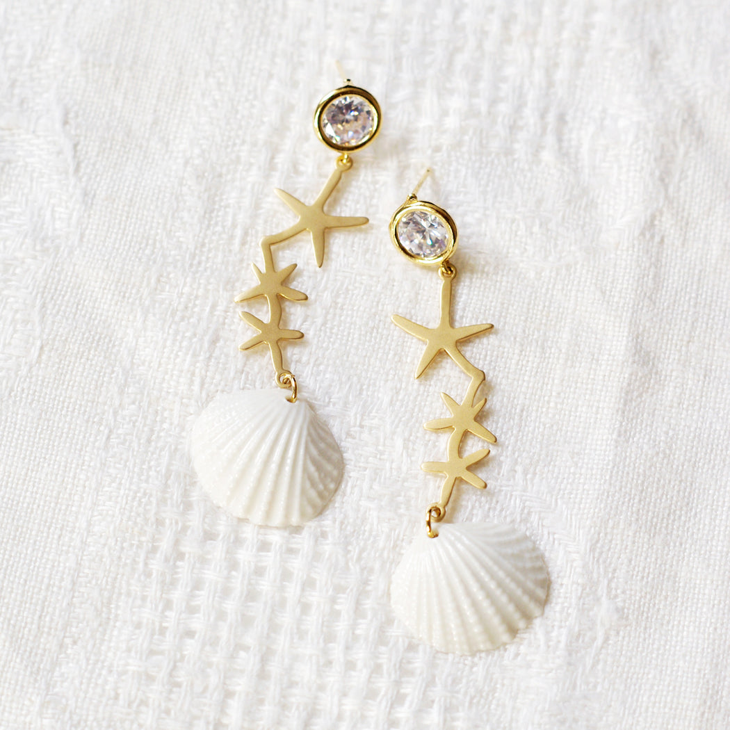It’s a story inspired from the moonlight ocean. White porcelain shells, golden stars and clear stones compose these unique and delicate earrings.