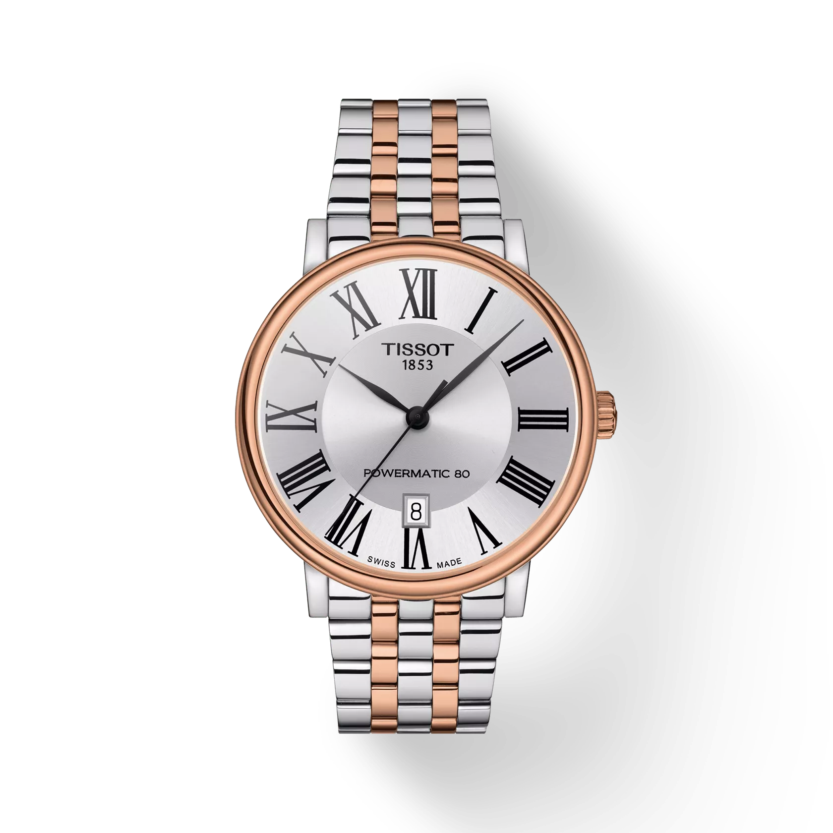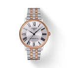 The Tissot Carson Automatic (Model T122.407.22.033.00) is a timeless men’s watch designed for any occasion. Its silver dial features elegant Roman indexes and elongated hands, complemented by a sophisticated rose gold 5N PVD-coated stainless steel bracelet with butterfly clasp. The 40 mm stainless steel case with see-through caseback houses a Swiss automatic movement with up to 80 hours of power reserve. Domed scratch-resistant sapphire crystal and 50 m water resistance provide durability while maintaining classic elegance.