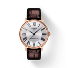 The Tissot Carson Automatic (Model T122.407.36.033.00) is a timeless men’s watch, ideal for every occasion. Featuring a 40 mm stainless steel case with rose gold PVD coating and a silver dial with Roman numeral indexes, it exudes classic elegance. The alligator-style brown leather strap with quick-release buckle complements the graceful dial and elongated hands. Powered by a Swiss automatic movement with up to 80 hours of power reserve and visible through a see-through caseback, this watch ensures precise timekeeping. Scratch-resistant domed sapphire crystal and 50 meters water resistance make it both stylish and durable.