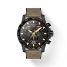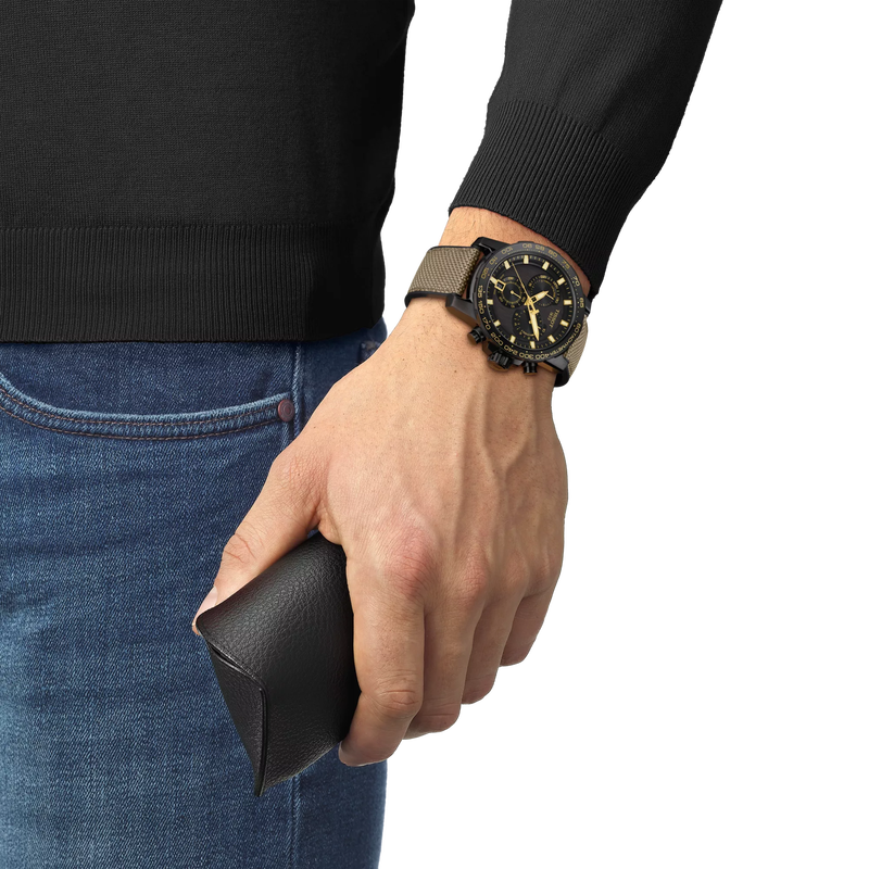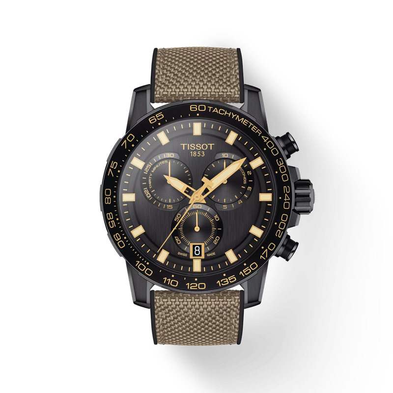 The Tissot Supersport Chrono is a bold and futuristic sports chronograph designed for men who appreciate dynamic style and Swiss precision. Featuring a 45.5 mm black PVD-coated stainless steel case, a clean black dial with luminous indexes, and a distinctive black and beige leather strap, this timepiece delivers powerful presence and everyday versatility.