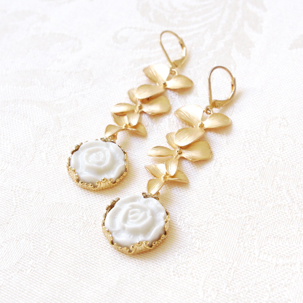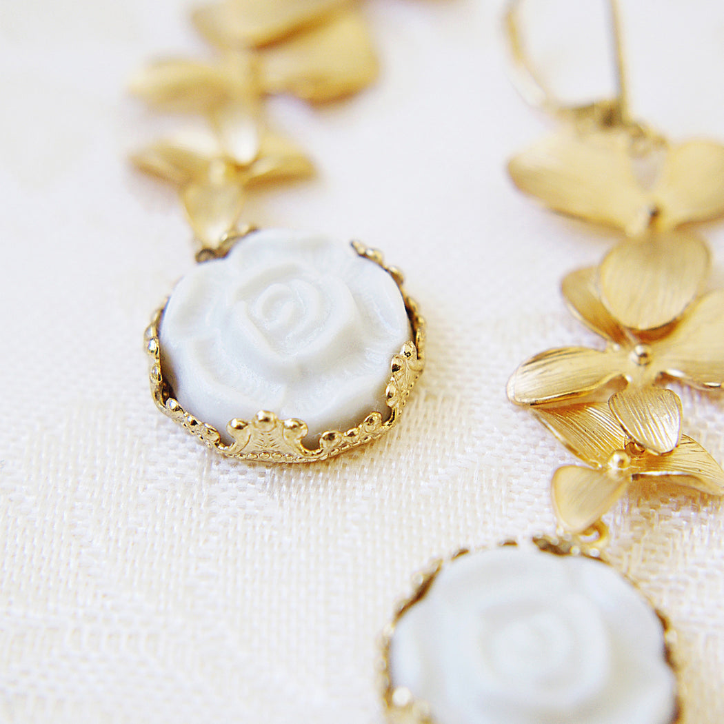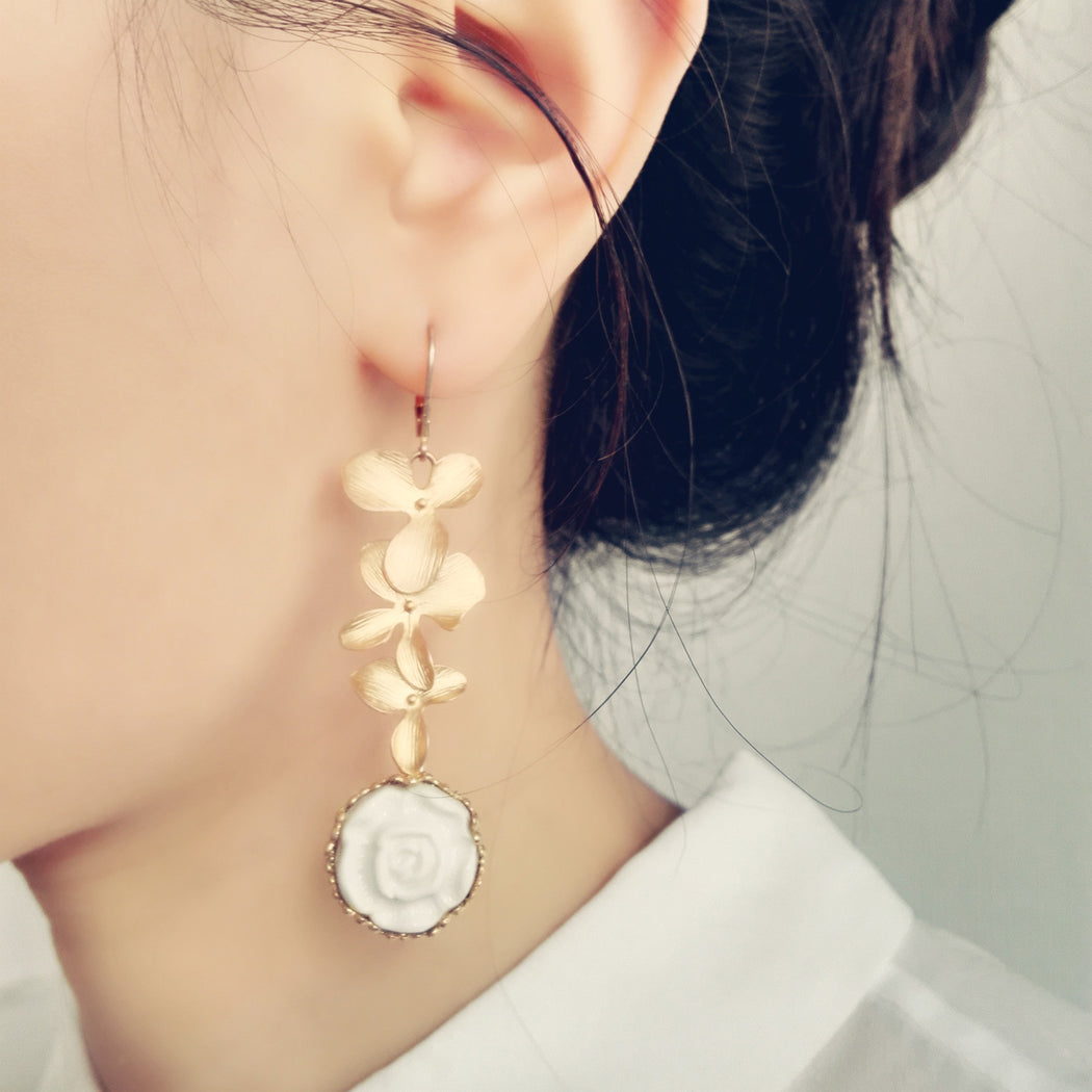 Porcelain Moonlight Rose and Triple Leaves Drop Earrings
