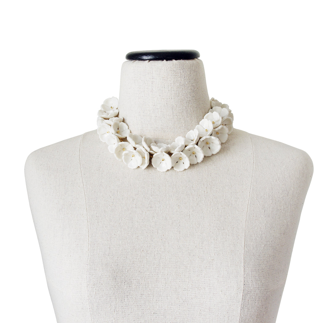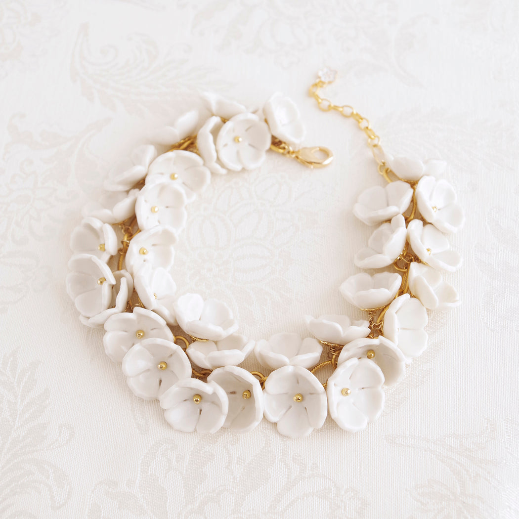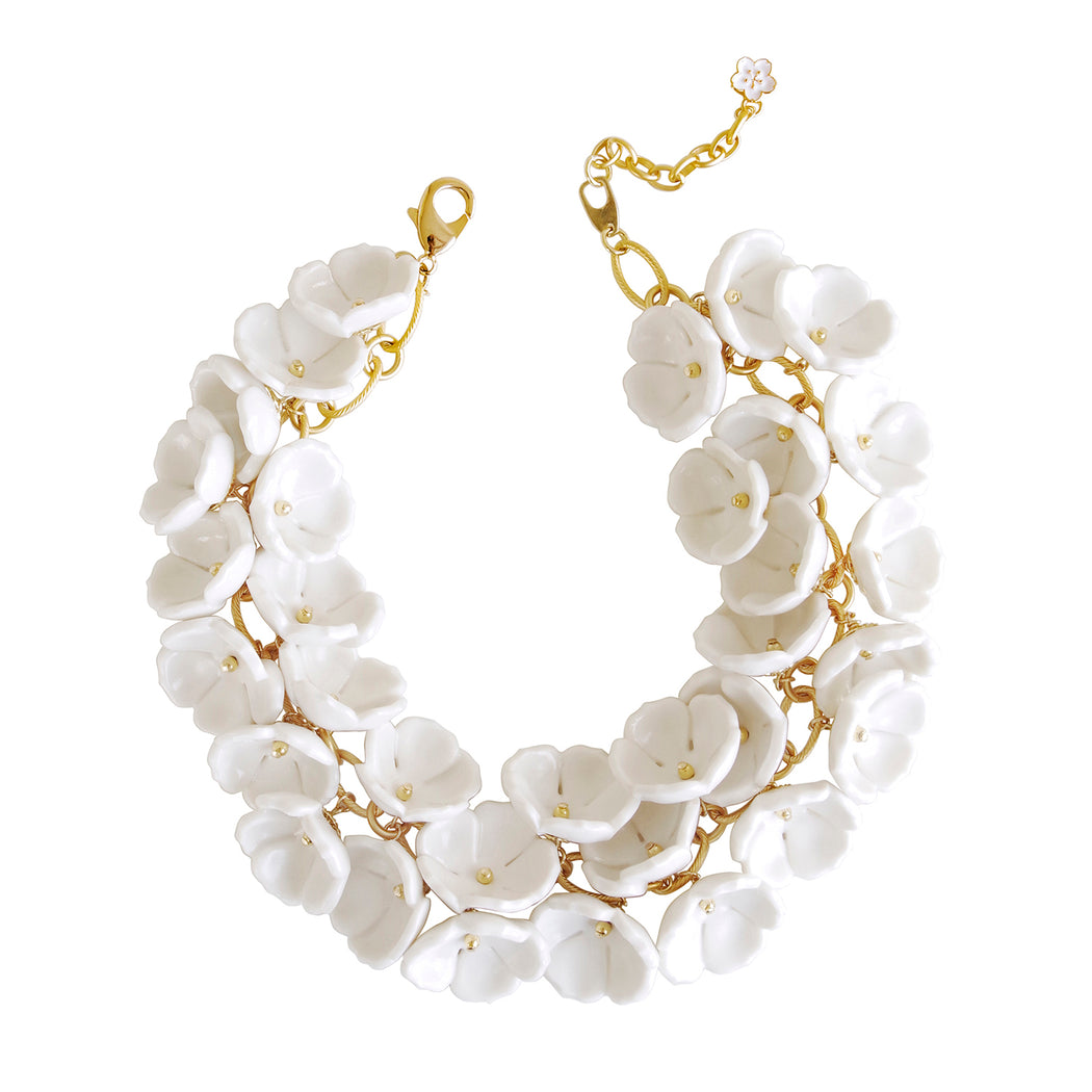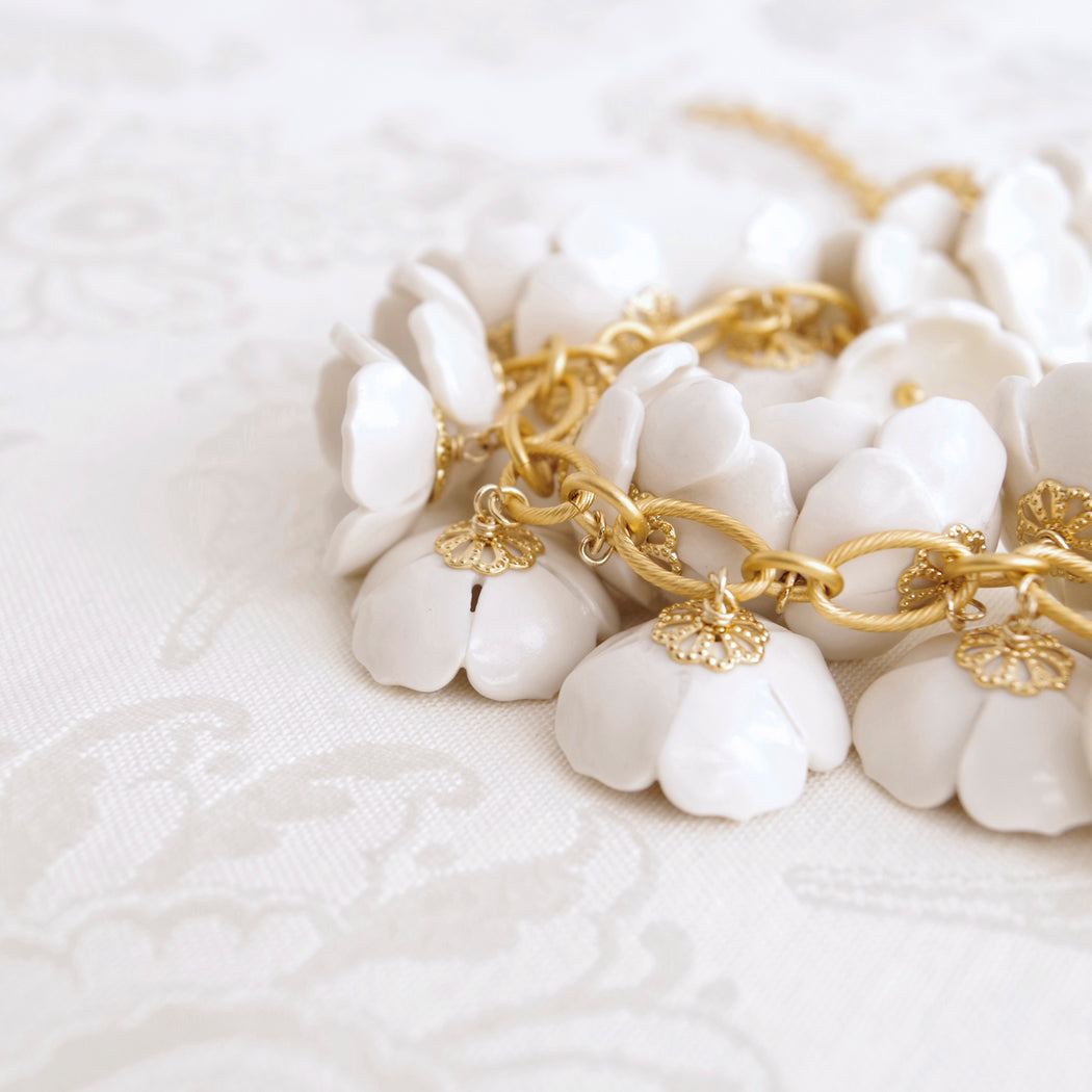 The beautiful plum blossom, who never fears frost and snow, bravely flowers in the coldest seasons, awakening spring and bringing hope. The pure and delicate petals deserve your extra love and care. Necklace is made of 33 pieces of handcrafted porcelain plum blossom flowers and gold-plated chains.