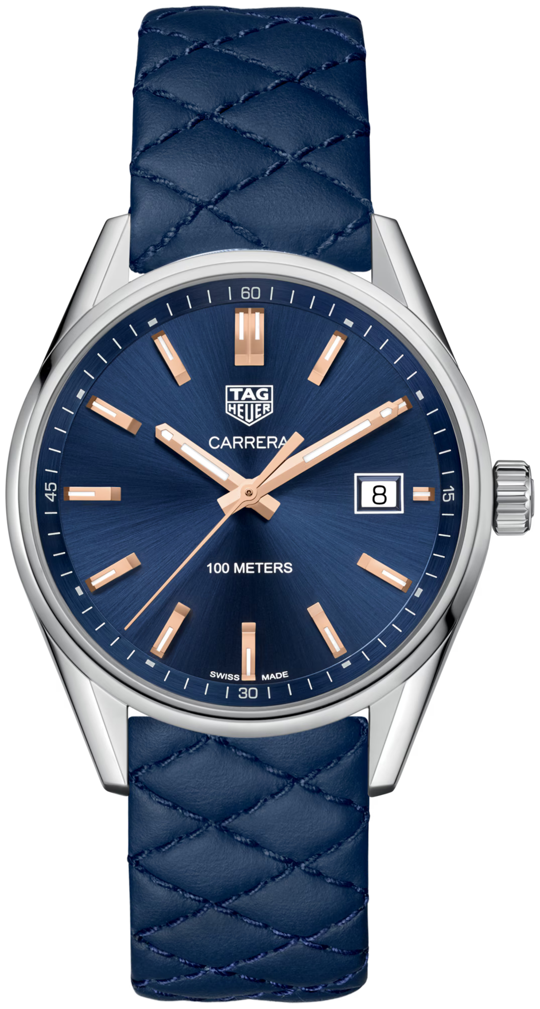 The TAG Heuer Carrera Quartz (Model WAR1112.FC6391) is a sophisticated 39 mm men’s watch featuring a polished steel case and fixed steel bezel. Its deep blue dial paired with a matching leather strap and polished steel folding clasp exudes elegance, while the precise Swiss-made Quartz movement ensures reliable timekeeping. A refined choice for both casual and formal occasions.