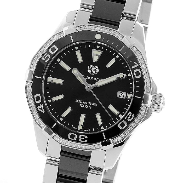 The TAG Heuer Aquaracer WAY131G.BA0913 elevates aquatic luxury with a 35 mm steel case, black sun ray dial, diamond bezel and Swiss quartz precision. With 300 m water resistance and a refined steel & ceramic bracelet, this Swiss made timepiece merges upscale jewellery aesthetics with professional dive DNA—designed for those who demand both elegance and endurance.