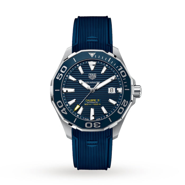 The TAG Heuer Aquaracer WAY201B.FT6150 features a 43 mm polished and brushed steel case, deep blue sunray dial, blue rubber strap, and ceramic bezel. Driven by the Calibre 5 automatic movement with ~38 hour power reserve and offering 300 m water resistance. This Swiss made luxury timepiece merges professional dive watch performance with refined aesthetics — ideal for the enthusiast who demands both legibility under pressure and premium wrist presence.