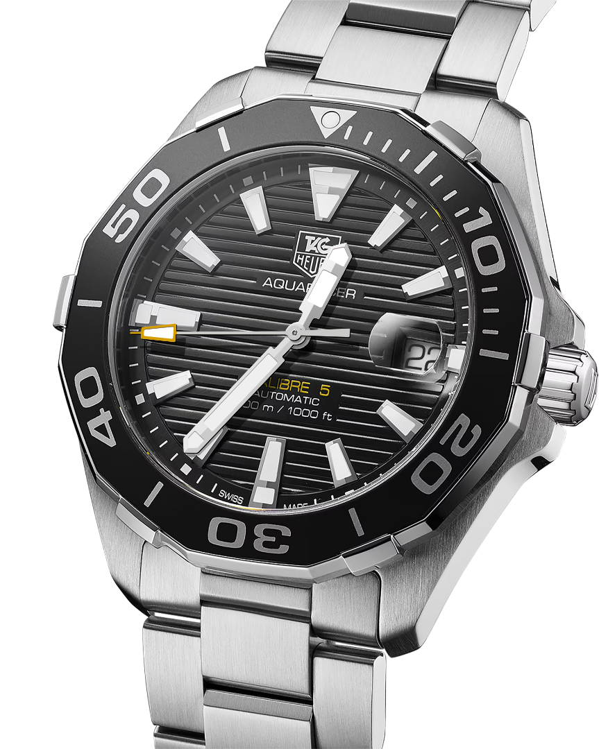 The TAG Heuer Aquaracer WAY211A.BA0928 is a Swiss-made men’s automatic diving watch designed for durability and high performance. Featuring a 41 mm steel case with a black sunray-brushed dial and a steel & ceramic turning bezel, this timepiece combines rugged sportiness with refined elegance. Powered by the Calibre 5 Automatic movement, it offers a 38-hour power reserve and operates at 28,800 vibrations per hour. Water-resistant up to 300 meters and equipped with a screw-down crown and folding clasp steel bracelet, it is ideal for professional diving and everyday wear.