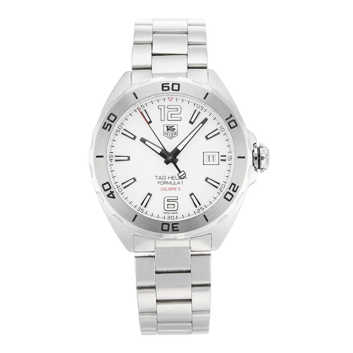 The TAG Heuer Formula 1 Automatic (Model WAZ2114.BA0875) is a bold Swiss-made 41 mm timepiece that combines sporty style with precise performance. Featuring a stainless steel case and bracelet with fine-brushed finishes, it houses a Calibre 5 automatic movement with a 38-hour power reserve and a 28,800 vph balance frequency. The crisp white dial displays hours, minutes, seconds, and date, while the turning bezel and water resistance up to 200 meters ensure this watch is as durable as it is elegant.