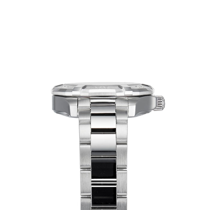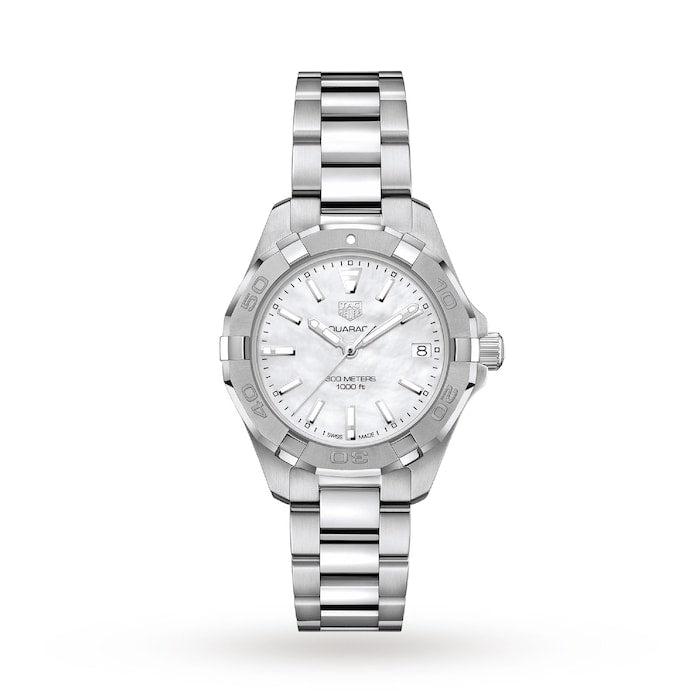 The TAG Heuer Aquaracer WBD1311.BA0740 features a 32 mm steel case, luminous white mother of pearl dial, Swiss quartz movement and 300 m water resistance. Crafted with the same dive ready engineering as its larger siblings, it offers compact luxury with professional durability—an elegant statement of Swiss made precision on the wrist.