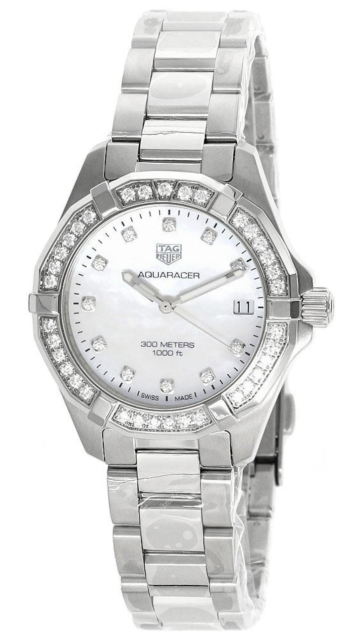 The TAG Heuer Aquaracer WBD1315.BA0740 features a 32 mm steel case, white mother of pearl dial, 11 diamond hour markers plus 35 diamonds set around the bezel (~0.593 ct total), Swiss quartz movement and 300 m water resistance. A striking fusion of sport heritage durability and refined gem level detail—crafted for those who demand Swiss luxury and high performance wristwear.