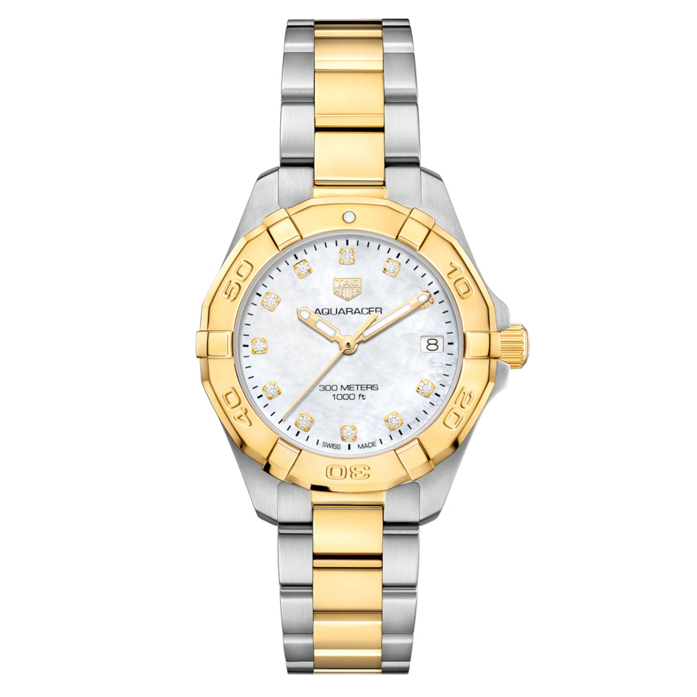 The TAG Heuer Aquaracer WBD1322.BB0320 features a 32 mm steel case with gold plated bezel, a mother of pearl dial with 11 diamond markers (0.11 ct), quartz movement and 300m water resistance. A refined fusion of high performance diving features and luxurious details, this Swiss made timepiece enriches wrist style with both elegance and technical precision.
