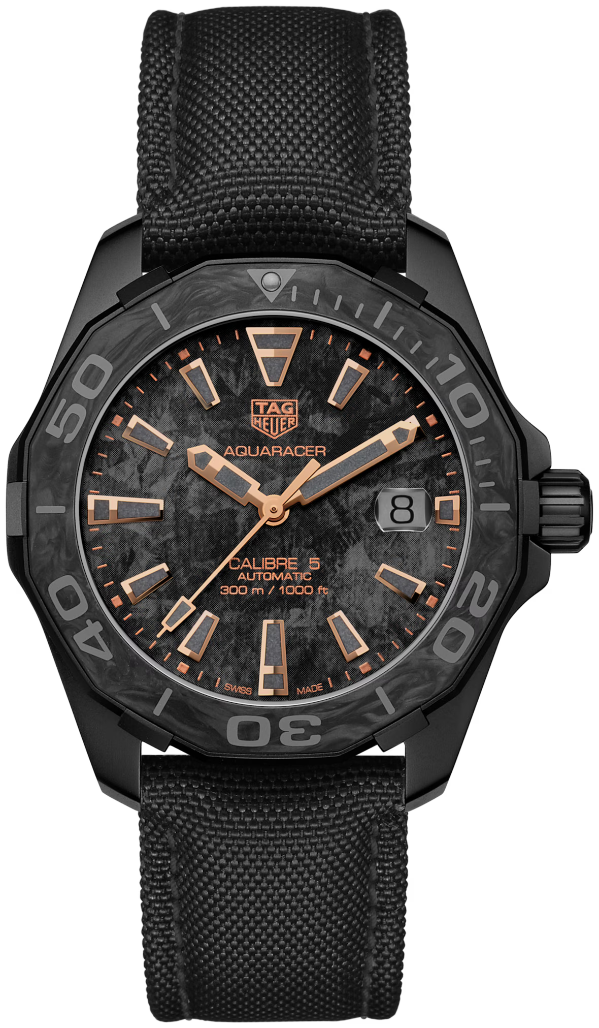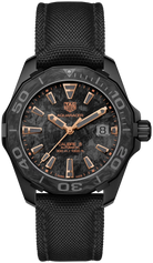 The TAG Heuer Aquaracer WBD218A.FC6445 blends rugged durability with refined Swiss craftsmanship. This 41 mm timepiece features a titanium and carbon case with a carbon turning bezel, powered by the reliable Calibre 5 Automatic movement. Finished with a black nylon strap and folding clasp, it is water-resistant up to 300 meters, perfect for both daily wear and adventurous aquatic pursuits.