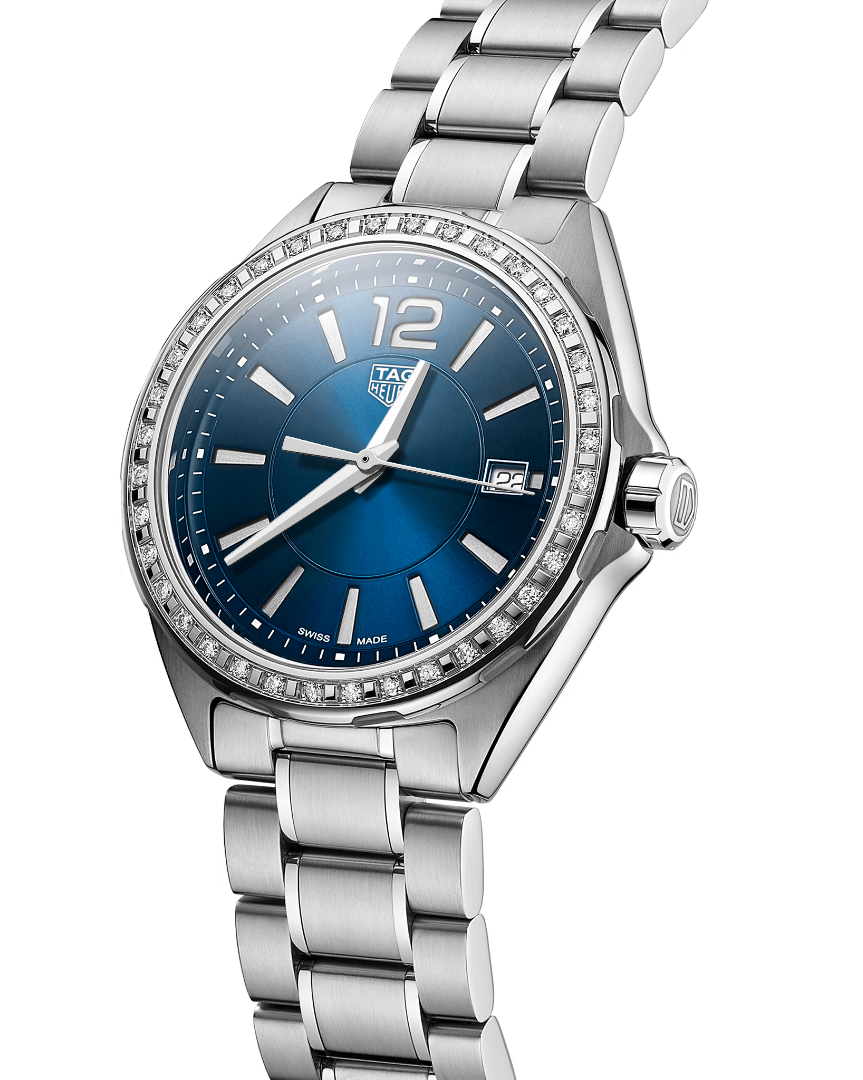 The TAG Heuer Formula 1 WBJ1316.BA0666 is a Swiss-made quartz watch that blends sporty elegance with classic luxury. This 35 mm steel timepiece features a sunray-brushed blue dial that changes shade with wrist movement and a dazzling bezel set with 36 diamonds (0.28 CT). Its five-row brushed and polished steel bracelet enhances the refined aesthetic. Powered by a precise quartz movement, it displays hours, minutes, seconds, and date functions, and is water-resistant up to 100 meters.