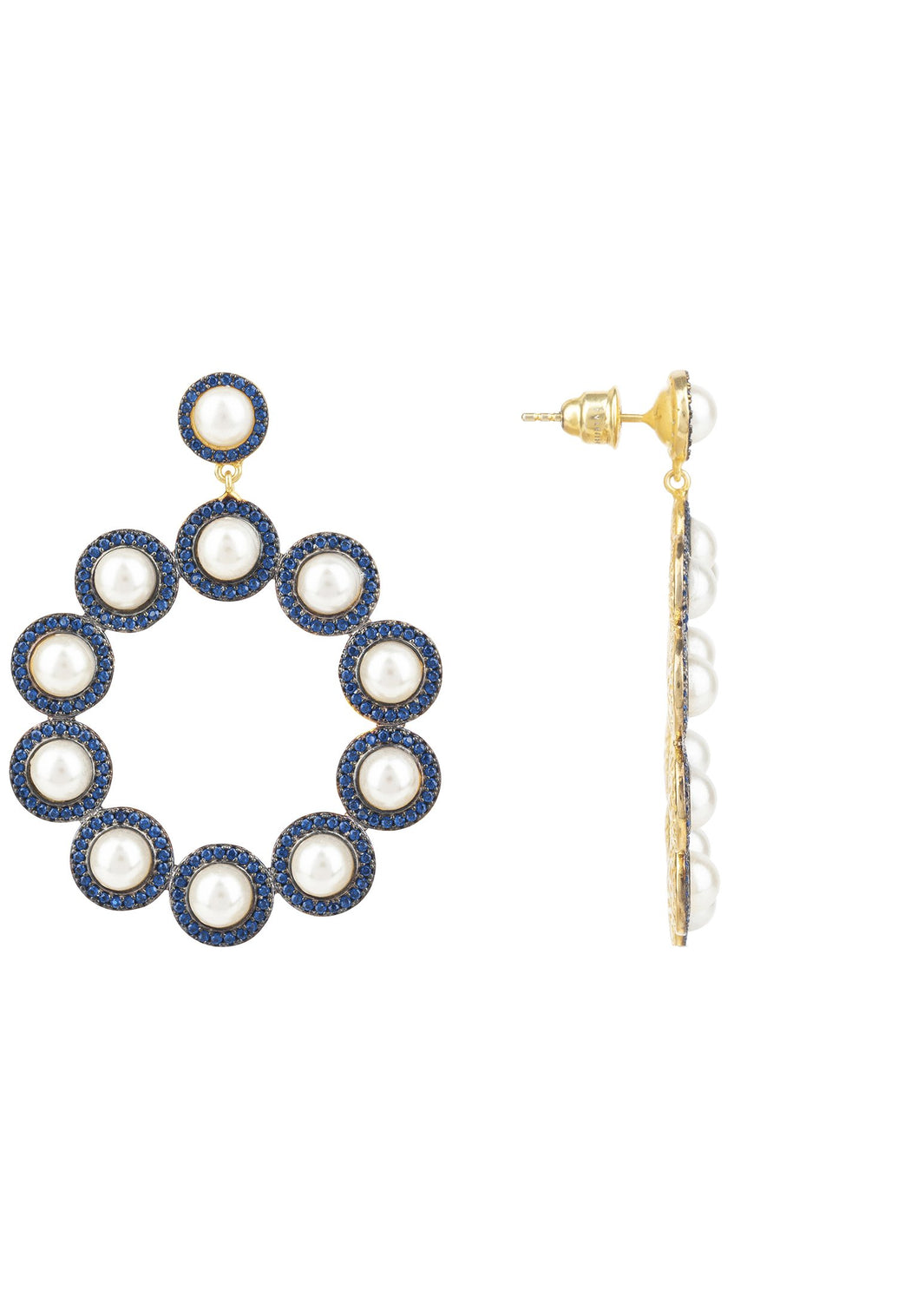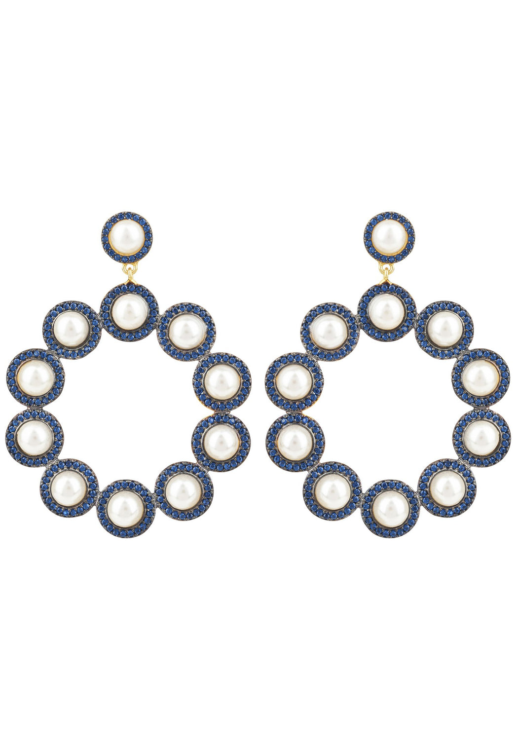 The vast amount of zirconia make these earrings hypnotic with their dazzling effect as they catch the light from day to night, each pearl is surrounded by sapphire blue zircons.