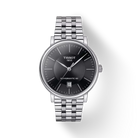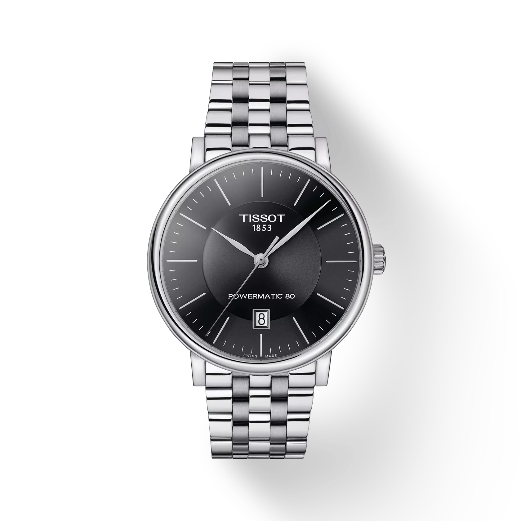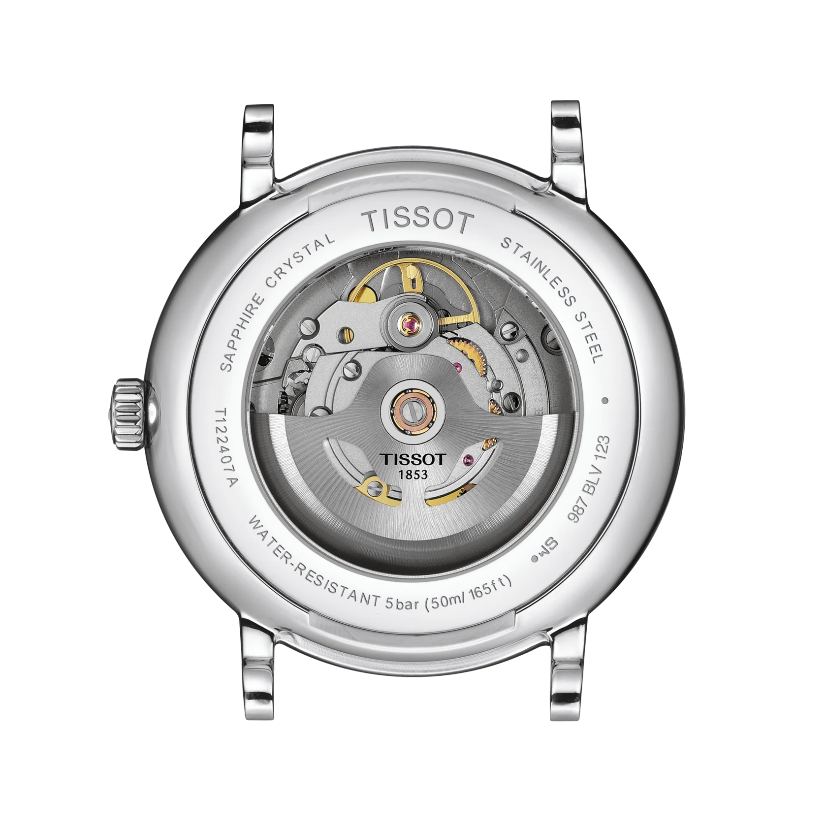 The Tissot Carson Automatic (Model T122.407.11.051.00) is a timeless watch suitable for any time and place. Designed for both men and women, it features a sleek black dial with slim, curved hands and classic indexes, framed by the elegant double gadroon bezel. Powered by a Swiss automatic movement with an impressive 80-hour power reserve, it delivers exceptional precision and autonomy. The 40 mm stainless steel case with see-through caseback is paired with a grey alligator-style cowhide strap and butterfly clasp, completing this sophisticated timepiece.