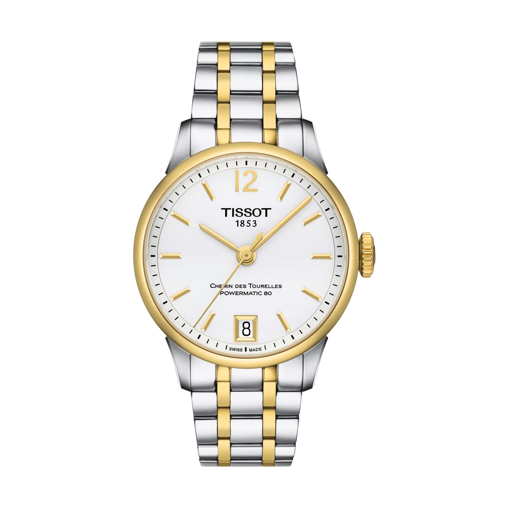 The Tissot Chemin des Tourelles Powermatic 80 Lady is a timeless expression of Swiss heritage and refined elegance. Crafted in a 32 mm 316L stainless steel case with yellow gold PVD coating, it features a sophisticated silver dial with Arabic numerals and indexes for a classic yet contemporary look. Powered by a Swiss automatic movement with up to 80 hours of power reserve, the watch includes a see-through caseback and a domed scratch-resistant sapphire crystal with antireflective coating. A PVD-coated bracelet with butterfly clasp completes this luxurious and versatile timepiece.