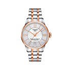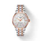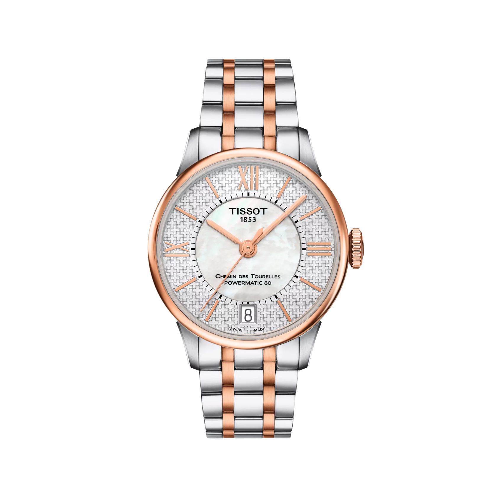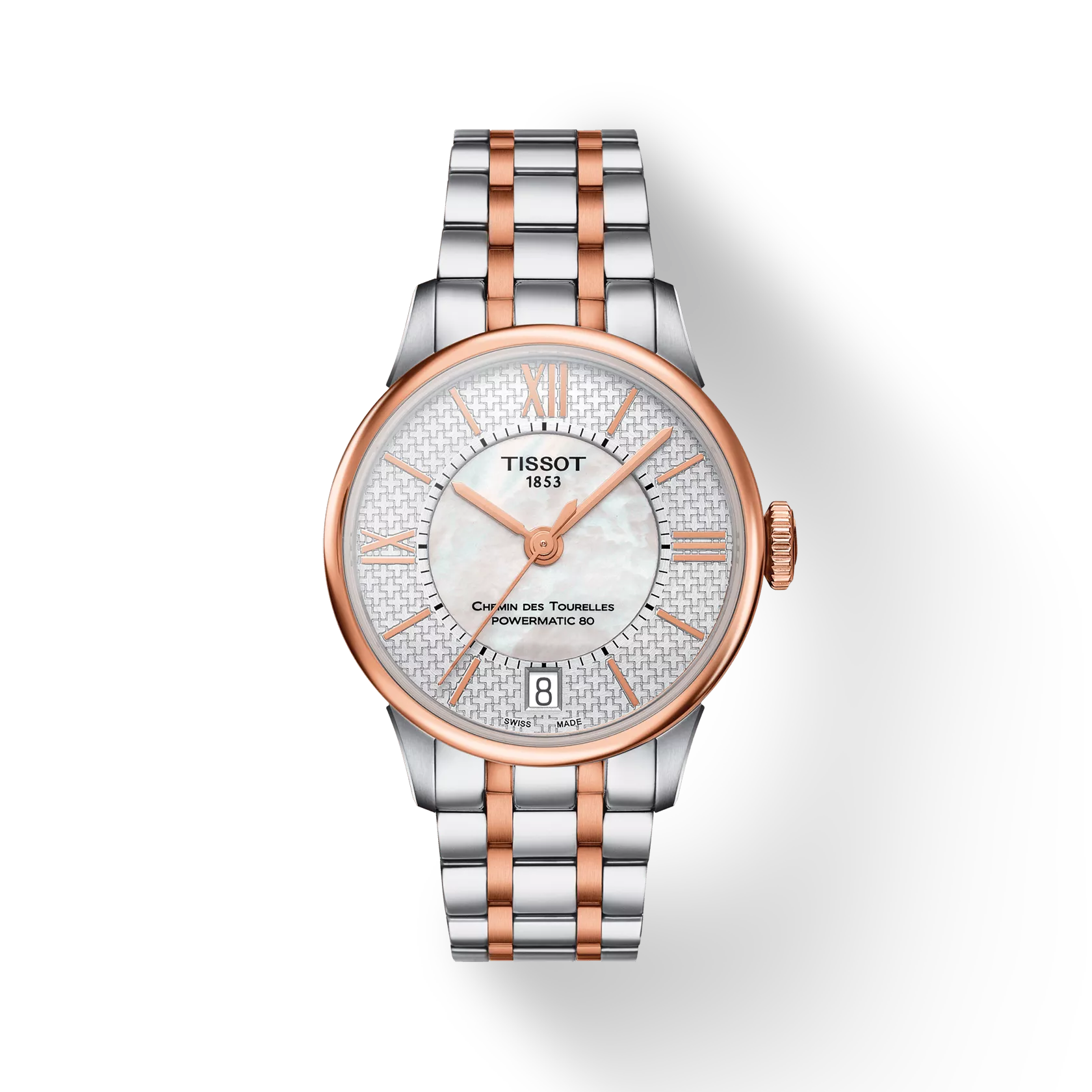 The Tissot Chemin des Tourelles Powermatic 80 Helvetic Pride Lady is a tribute to Swiss heritage and exceptional craftsmanship. Its 32 mm 316L stainless steel case features a mother-of-pearl dial, each naturally unique in color and reflection. Powered by a Swiss automatic movement with up to 80 hours of power reserve, the watch includes an engraved caseback inspired by the Swiss franc coin and a domed scratch-resistant sapphire crystal with antireflective coating. A grey and rose gold PVD-coated bracelet with butterfly clasp completes this elegant and symbolic timepiece.